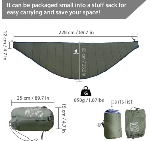Ватенката од 3 - 4 сезони Хамак е идеален за температури од 41 ° F до 68 ° F; Совршено е во облик за да се вклопи виси хамак, што ве штити од ветрот и ве одржува топло коконирано.